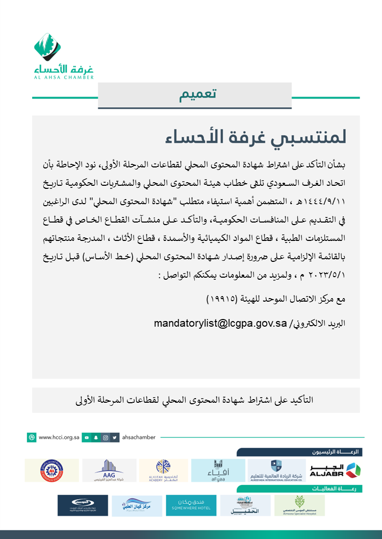 التأكيد على اشتراط شهادة المحتوى المحلي لقطاعات المرحلة الأولى