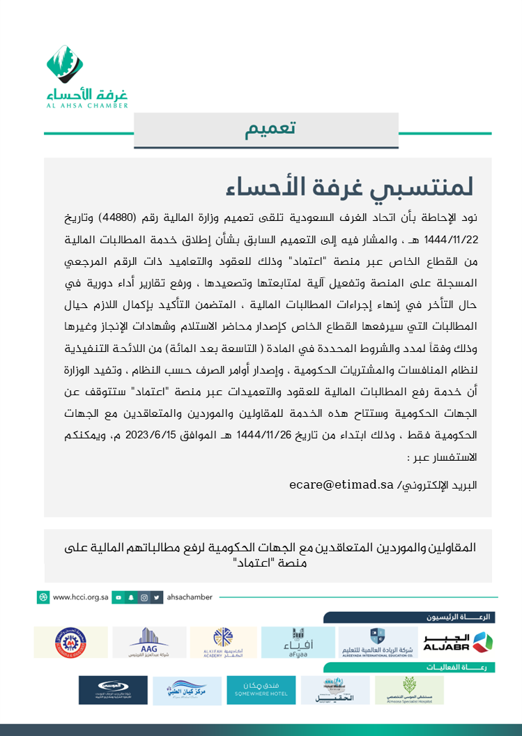 المقاولين والموردين المتعاقدين مع الجهات الحكومية لرفع مطالباتهم المالية على منصة اعتماد