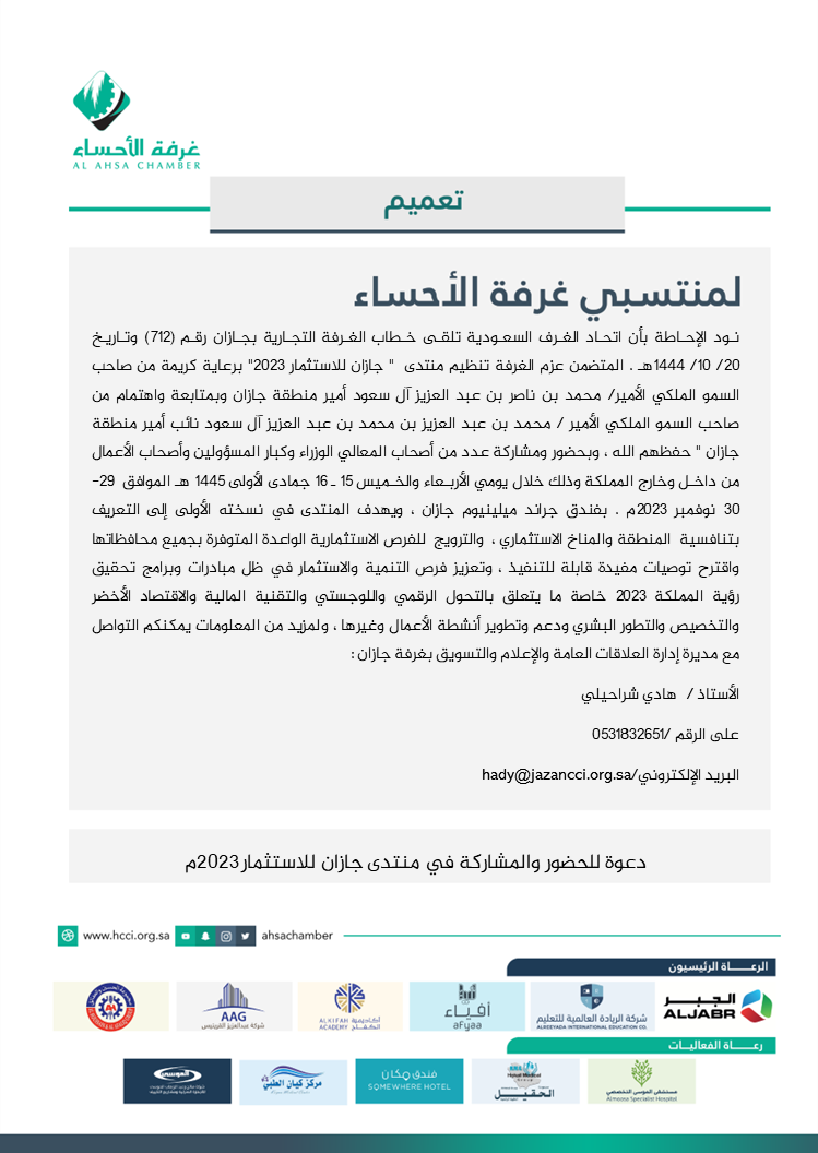 دعوة للحضور والمشاركة في منتدى جازان للاستثمار 2023م