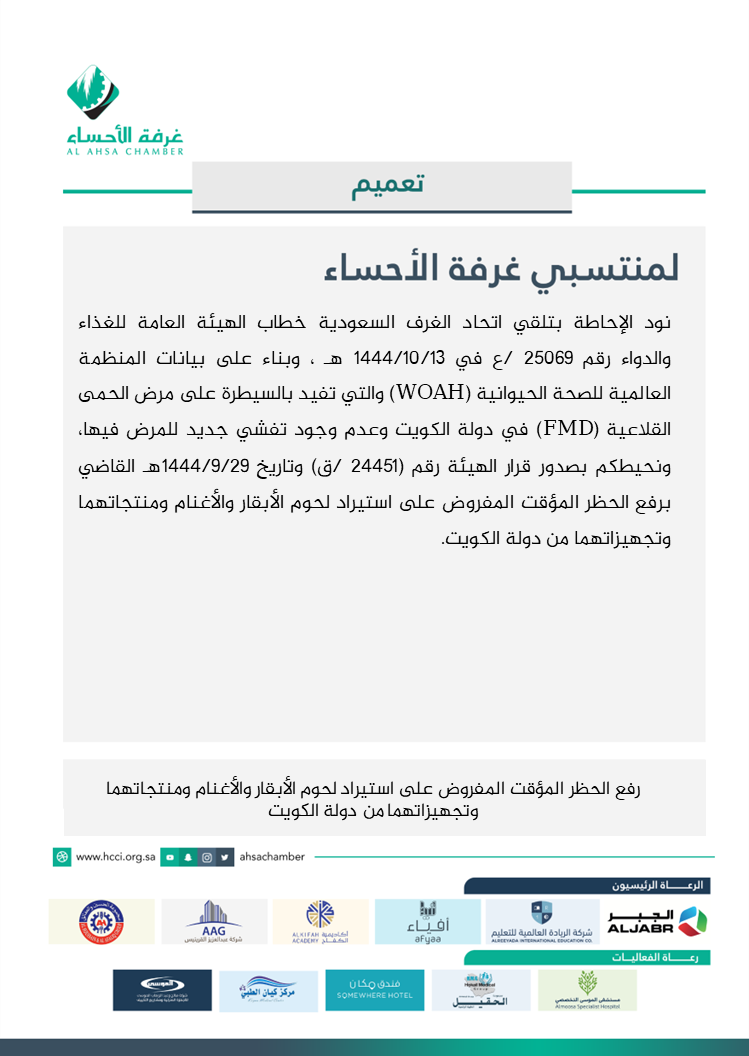 رفع الحظر المؤقت المفروض على استيراد لحوم الأبقار والأغنام ومنتجاتهما وتجهيزاتهما من دولة الكويت