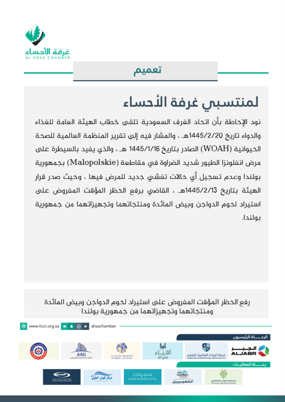 رفع الحظر المؤقت المفروض على استيراد لحوم الدواجن وبيض المائدة ومنتجاتهما وتجهيزاتهما من جمهورية بولندا
