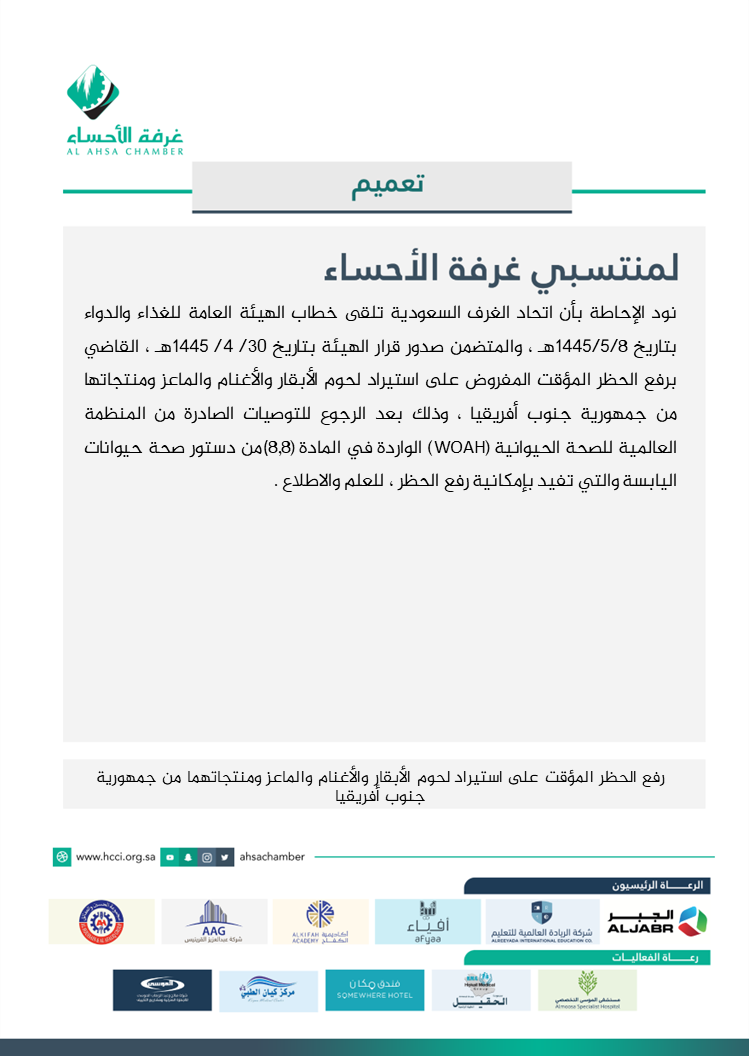 رفع الحظر المؤقت على استيراد لحوم الأبقار والأغنام والماعز ومنتجاتهما من جمهورية جنوب أفريقيا