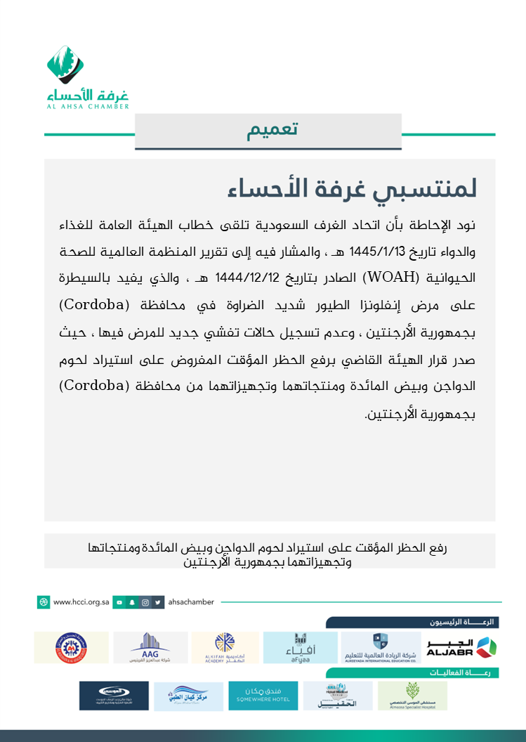 رفع الحظر المؤقت على استيراد لحوم الدواجن وبيض المائدة ومنتجاتها وتجهيزاتهما بجمهورية الأرجنتين