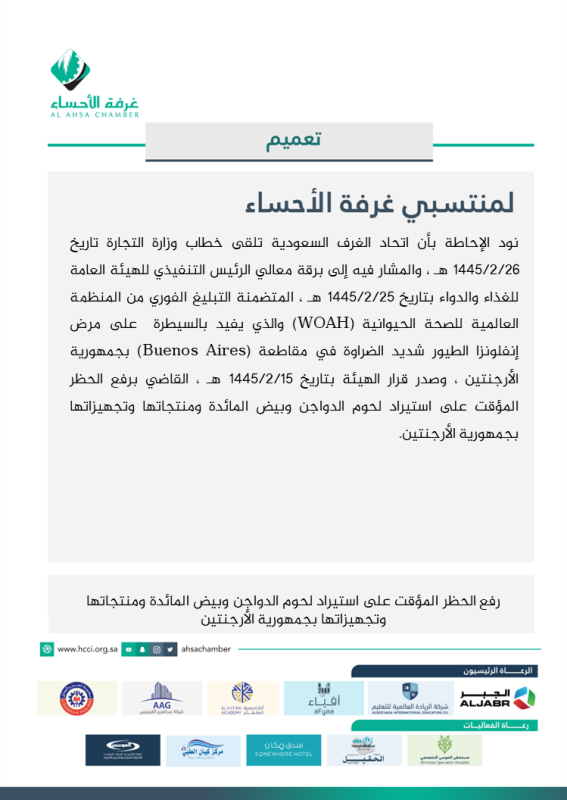 رفع الحظر المؤقت على استيراد لحوم الدواجن وبيض المائدة ومنتجاتها وتجهيزاتها بجمهورية الأرجنتين