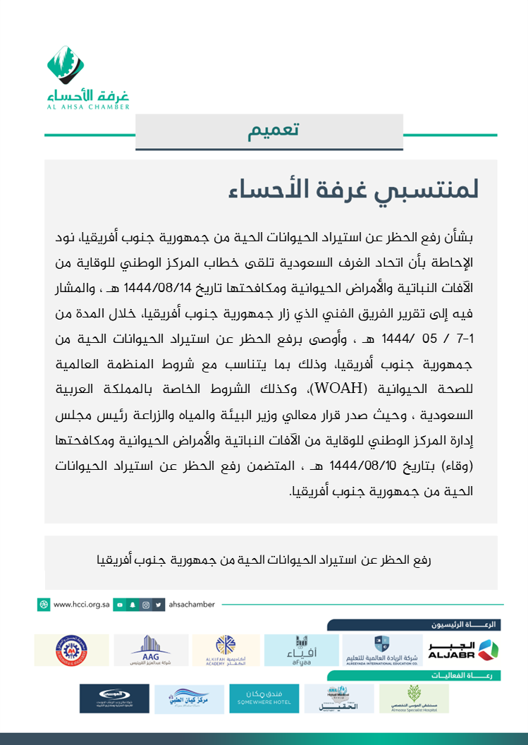 رفع الحظر عن استيراد الحيوانات الحية من جمهورية جنوب أفريقيا
