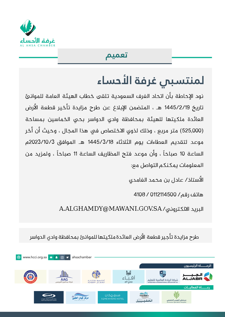 طرح مزايدة تأجير قطعة الأرض العائدة ملكيتها للموانئ بمحافظة وادي الدواسر