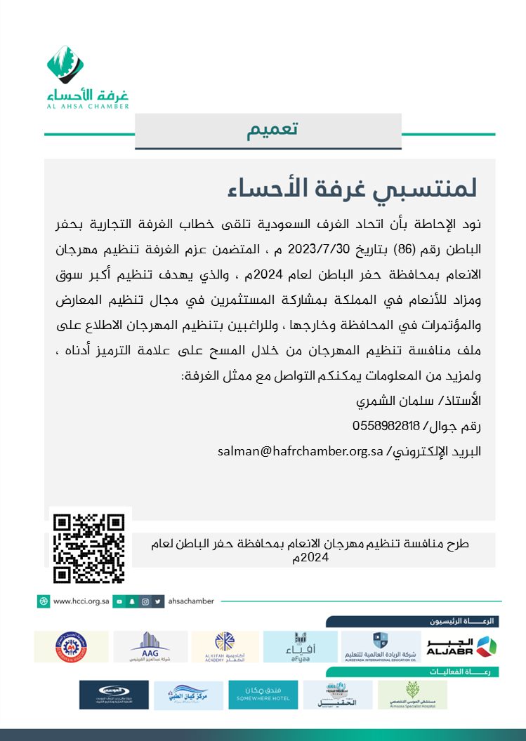 طرح منافسة تنظيم مهرجان الانعام بمحافظة حفر الباطن لعام 2024م