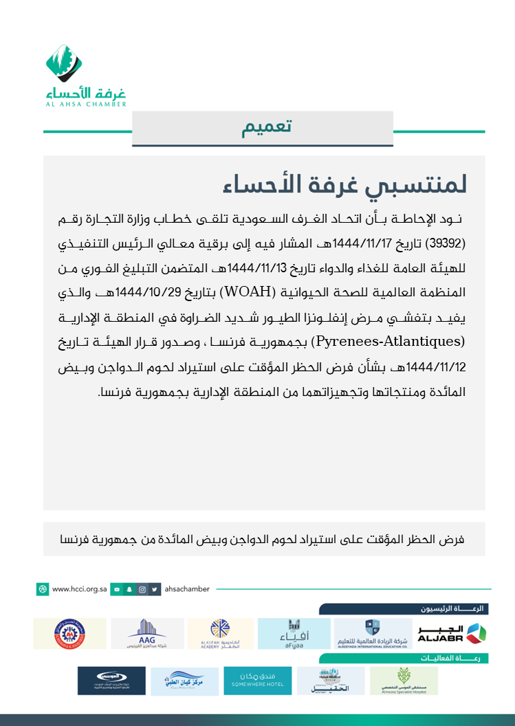 فرض الحظر المؤقت على استيراد لحوم الدواجن وبيض المائدة من جمهورية فرنسا