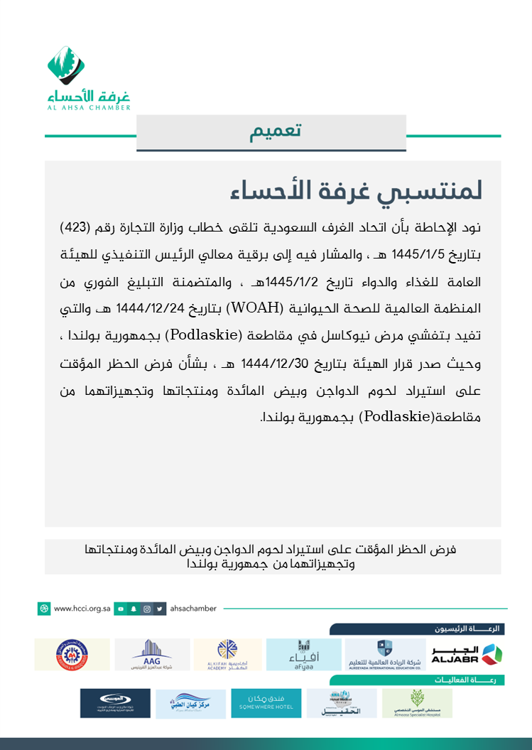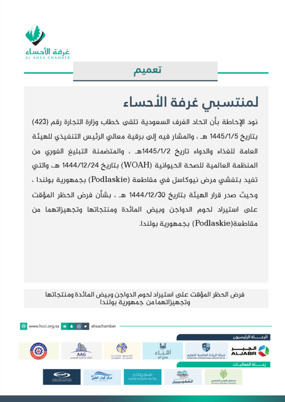 فرض الحظر المؤقت على استيراد لحوم الدواجن وبيض المائدة ومنتجاتها وتجهيزاتهما من جمهورية بولندا